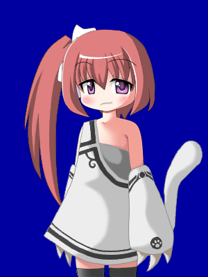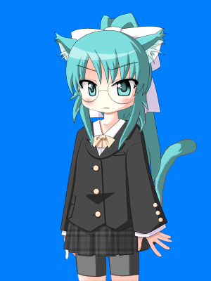服はブレザー+スパッツで、つり目で水髪のロングのポニーテールで猫耳+猫尾で真面目な感じのキャラ