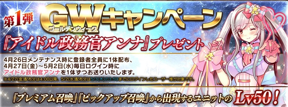 ・毎日ログイン時に『アイドル政務官アンナ』をプレゼント
