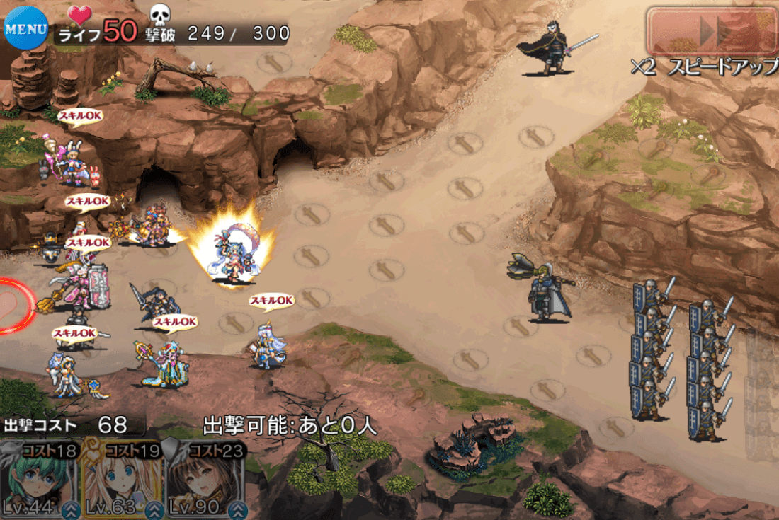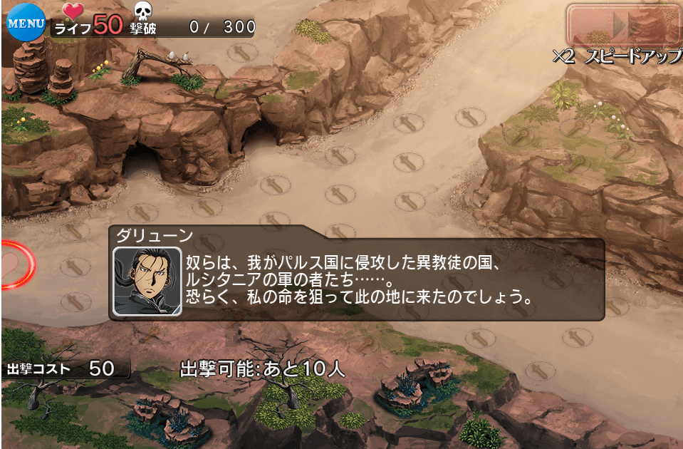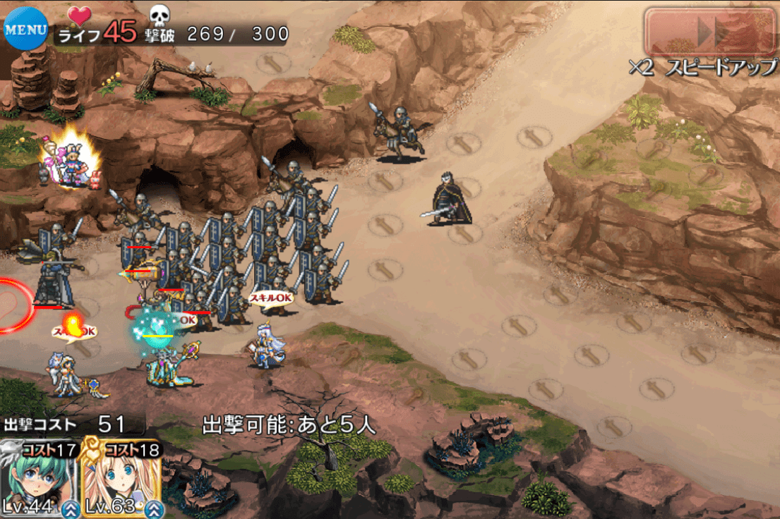 上にある岩壁の向こうから攻めてきたり、岩壁左上から弓兵が現れたり…。