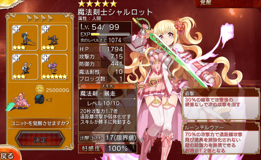 魔法剣士はイベ産のシャルロットが覚醒済み。